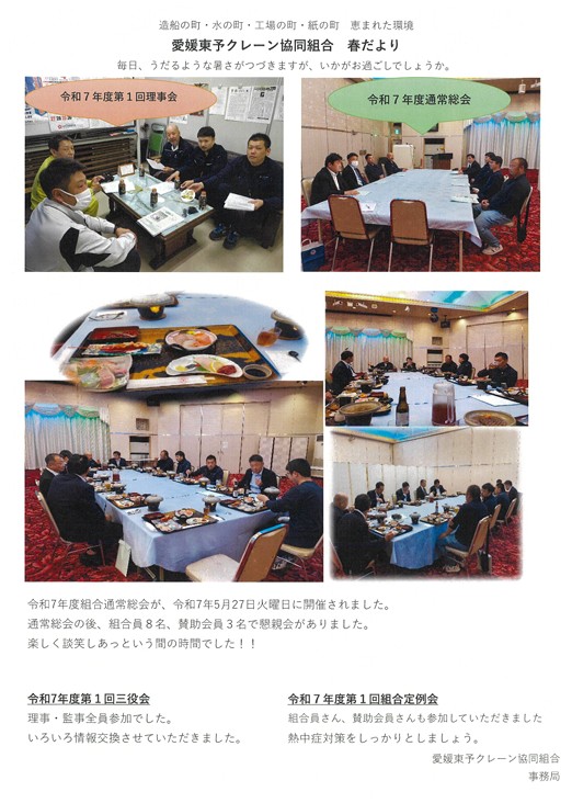 愛媛東予クレーン協同組合 春だより 2025年10月6日 最終更新日時 : 2025年11月25日 etcrane 愛媛東予クレーン協同組合春だよりを作成いたしました。 理事会・通常総会・三役会・定例会の様子等です。